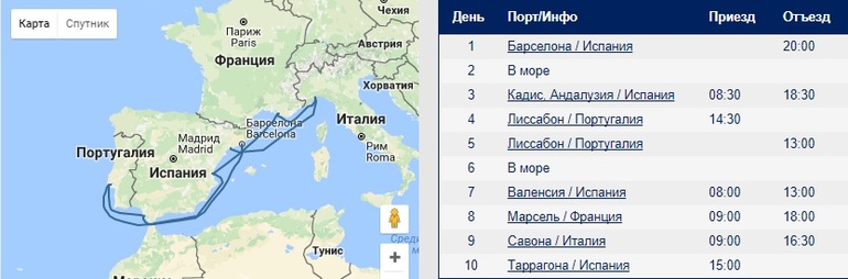 Маршрут из Барселоны (из Марселя такие же порты, но сам круиз круговой, т.е. начало и конец в Марселе: