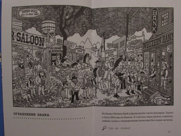 В книге использованы оригинальные черно-белые иллюстрации от Ганса Юргена Пресса - автора детских книг с загадками в рисунках. Его считают «отцом виммельбуха». В книгах Пресса очень необычные винтажные картинки с множеством деталей, среди которых спрятаны ответы на загадки. Таких иллюстраций вы не встретите в современных книгах.
