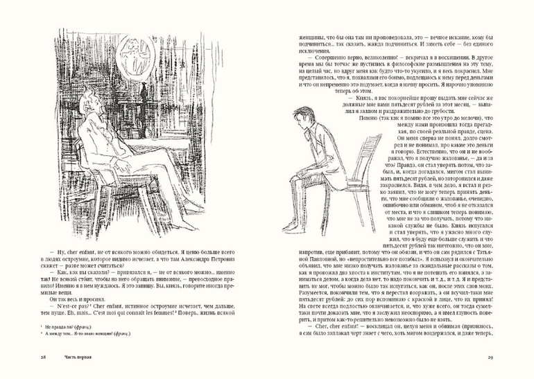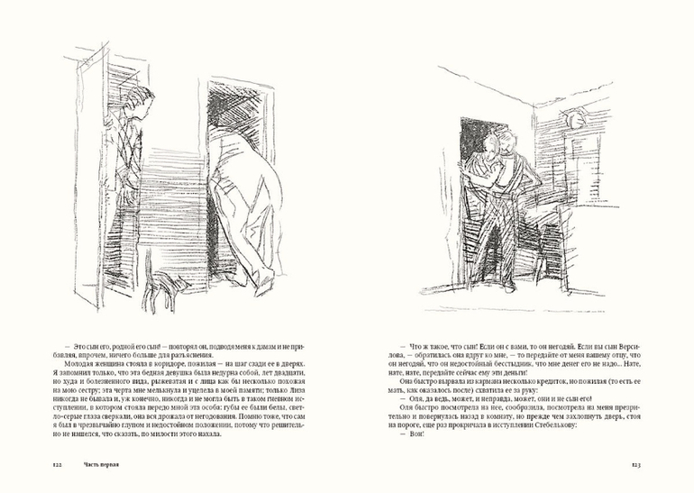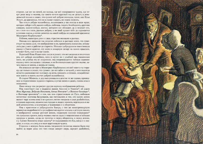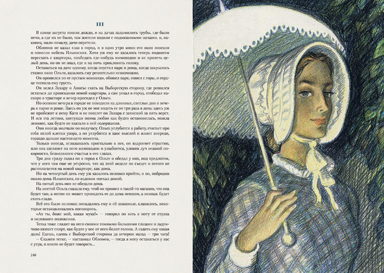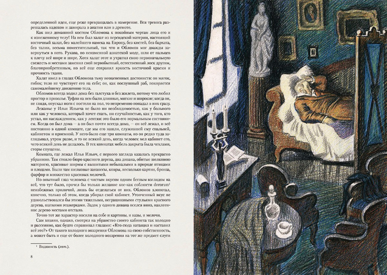 Многоплановый художник Юрий Гершкович для иллюстраций к «Обломову» выбрал стиль мягкий, округлый, словно бы сам Илья Ильич, не вставая с дивана, выпростал руку из шелкового халата да изобразил себя и всех вокруг.