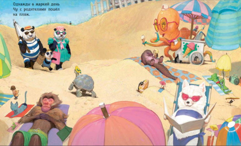 Третья книга о маленькой панде с богатырским суперчихом от мастера неожиданных сюжетов Нила Геймана. На этот раз Чу с родителями отправился на пляж. Ему не терпится поскорее начать играть в песке и плескаться в воде. Вот только яркое солнышко так щекотит нос… Интересно, что случится, если Чу чихнёт на пляже? Ведь, кажется, здесь нечему ломаться? Или всё-таки есть? Ребёнок может прочитать эту историю не только с родителями, но и самостоятельно. Детская непосредственность изложения Нила Геймана и смешные иллюстрации Адама Рекса сделали панду Чу необычайно популярным персонажем во всём мире.