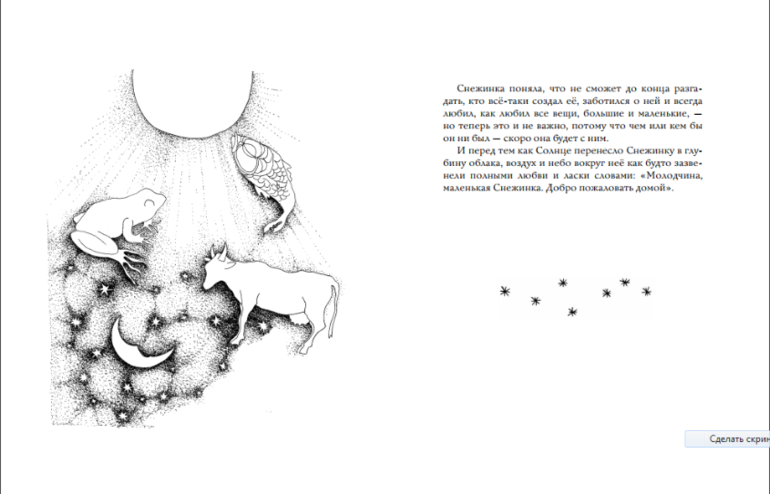 Философская повесть-притча о жизни маленькой снежинки от автора книг "Томасина", "Дженни", "Цветы для миссис Харрис", "Снежный гусь". Снежинка упала на землю в канун Рождества и, совсем как человек, прожила длинную, исполненную радостей и печалей жизнь и задумалась о том, для чего была создана. Неужели только для того, чтобы стать частью снеговика, которого слепили дети? Конечно, нет! Впереди её ждет долгая, полная приключений жизнь, которая закончится счастливым и очень важным открытием. Красивая история в переводе Олега Дормана с иллюстрациями Романа Рудницкого для детей 6-9 лет.