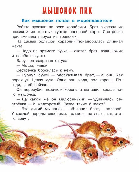 В сборник "Мышонок Пик" и другие сказки" вошли лучшие произведения замечательного детского писателя и знатока родной природы Виталия Валентиновича Бианки (1894 - 1959). Основное место занимает сказка "Мышонок Пик" - об отважном маленьком зверьке, преодолевающем в борьбе за жизнь множество испытаний. Рассказы и сказки писателя помогут ребёнку увидеть то, что скрыто от беглого взгляда, понять, насколько сложен, хрупок и прекрасен мир природы. Иллюстрации художника И. Цыганкова.