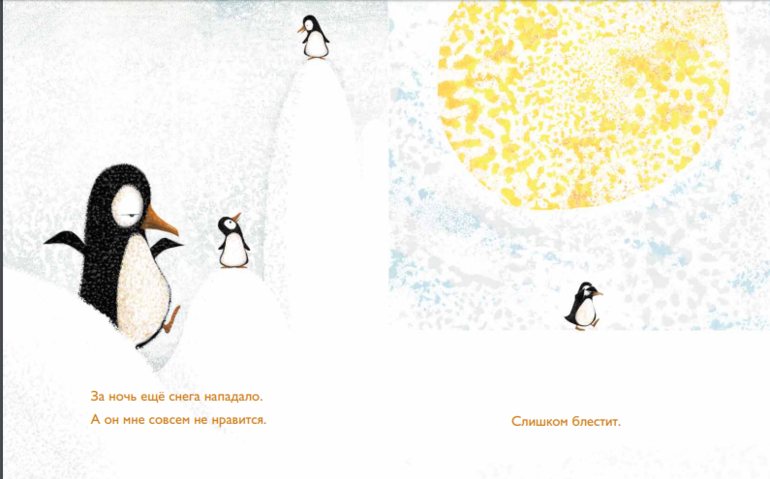У одного маленького пингвина однажды не задался день. Снег на солнце слишком блестит, ловить рыбу не хочется, клюв замерз и плавники устали. Но вдруг появляется морж и советует посмотреть на жизнь с другой стороны: какой красивый океан и горы вокруг, какое синее небо и как ласково солнце греет спину. Да, у нас всех бывают трудные дни, но никто не проживет нашу жизнь лучше нас самих. Если задуматься, каждый из нас находится там, где должен находиться.