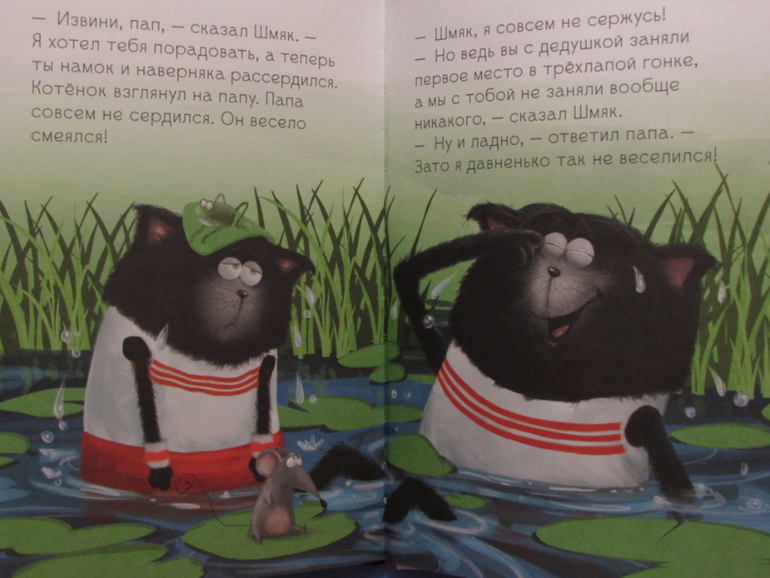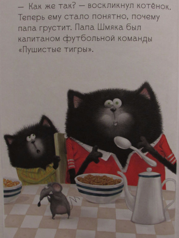 В книге очень трогательно рассказывается о том как Шмяк решил порадовать и развеселить папу. Оказалось, что папина футбольная команда проиграла решающий матч. Разве мог котенок оставить своего папу в плохом настроении?