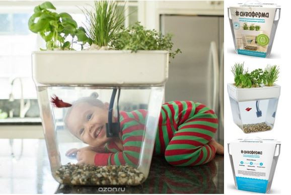 "Акваферма" представляет собой замкнутую экосистему, поддерживающую баланс между растениями и рыбкой. Это самоочищающийся аквариум, который выращивает урожай. Это действительно мини-ферма, благодаря которой любой городской житель может обеспечивать себя свежей зеленью к столу. Вы выращиваете свой собственный урожай и одновременно наблюдаете за жизнью рыбки, а все заботы о чистоте ее аквариума берут на себя растения. Система регулирует сама себя. В набор входит все необходимое для создания полноценной эко-фермы. Просто добавьте рыбку!