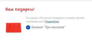 Акция Лабиринт - подарочки в НОВЫХ пунктах самовывоза. Если у Вас в городе несколько пвз, Вы можете попробовать оформить заказ в соседнем пункте, не там, где забираете обычно. Там даже без покупки книг однократно можно получить подарочек. Сейчас это блокнот "Три писателя". Условия акции