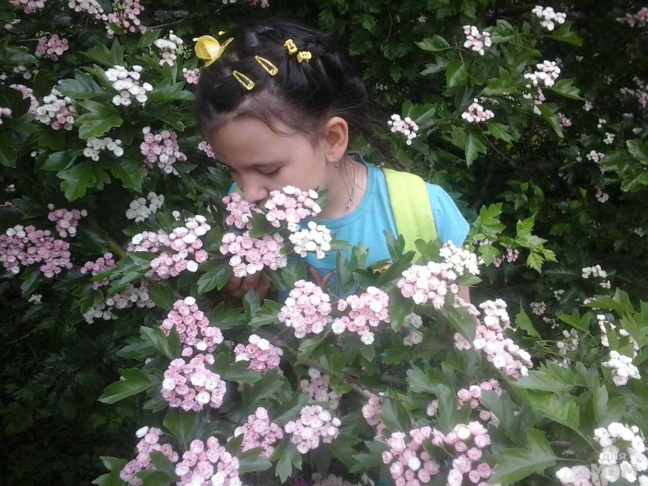 Живой цветок в волосах, найденный где-то на тропинке в Александровском саду. Приглядитесь к цветам, которые нюхает Софик - похожи на малюсенькие розочки.