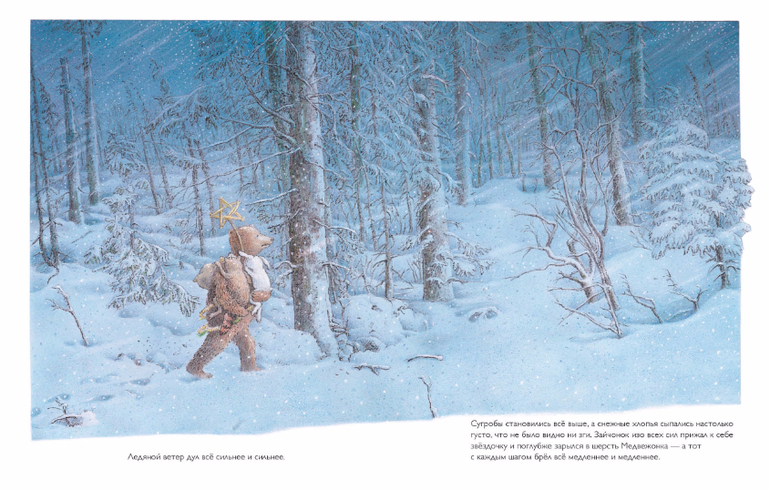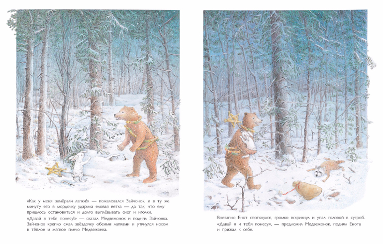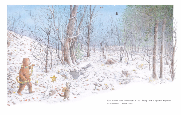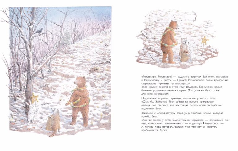 Рождественские подарки в этом году вышли на славу! Зайчонок, Медвежонок и Енот радостно спешат на праздник к своему другу Барсучонку. Однако по пути они попадают в снежную бурю, и ветер уносит прочь прекрасные гирлянды, разноцветные ёлочные игрушки и сверкающую Вифлеемскую звезду. Делать нечего, им приходится идти в гости с пустыми лапами.