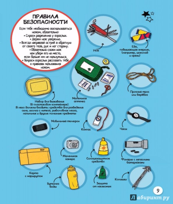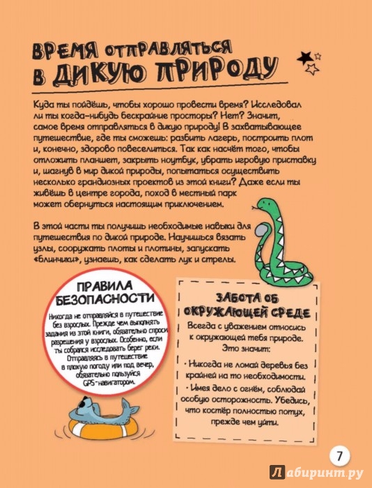 Ты узнаешь, как перейти реку и выбраться из зыбучих песков, как построить укрытие, плотину или плот, как поймать рыбу голыми руками и разжечь огонь без спичек, как найти дорогу в тумане, определить направление по звёздам, предсказать дождь и выследить животное по следам.