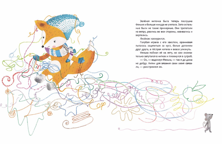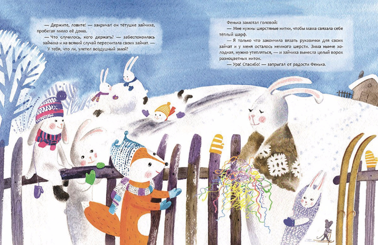 К маленькому лисёнку Феньке пришла первая зима. А он и не догадывался, что она может быть такой холодной! К счастью, мама связала Феньке тёплые шапку, шарф и рукавички - а значит, теперь можно и в мороз гулять целыми днями, и лепить снежки сколько хочешь! Вот только это совсем не в радость, когда мама сидит дома - ведь на Фенькину одёжку ушли все шерстяные нитки и для неё самой не осталось. Но Фенька - очень храбрый лисёнок, и, конечно, он отправляется на поиски шерстяных ниток для мамы.