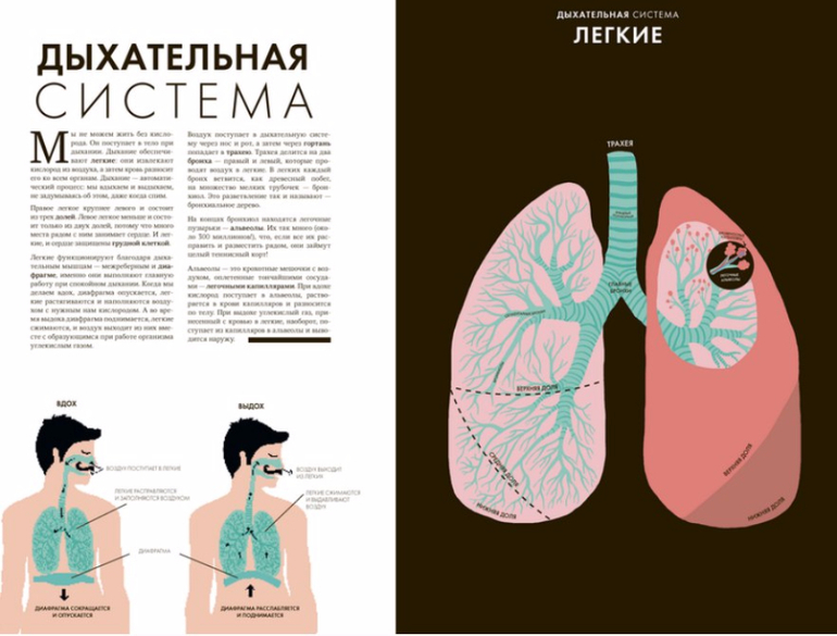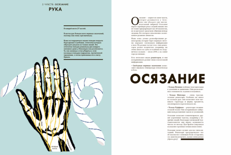 Иллюстрации в книге выполнены с помощью лазерной резки. Когда страницы наложены друг на друга, мы видим полную картину строения человеческого тела. Когда листаем страницы по одной, можем рассмотреть разные системы, понять, как и почему они работают. Вырезанные клапаны помогают заглянуть внутрь организма. Например, знакомясь с человеческим мозгом, сначала видим изображение головы, а подняв клапан, можем рассмотреть сам мозг и изучить его строение.
