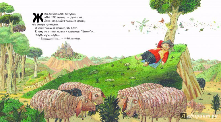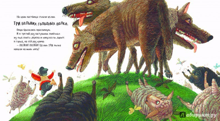 Мальчик-пастух день-деньской пас овец, и каждый его день был похож на предыдущий. Мальчику было скучнее всех на свете. Овцы щипали траву и блеяли. Они не хотели учиться забавным штукам, то есть, им было всё равно. И тогда пастушок побежал в город, крича: "Волк! Волк!" А приходил ли волк на самом деле? Нет, пастушку просто хотелось поразвлечься. Ведь так весело раз за разом отвлекать от работы всех жителей города. А что же случилось, когда пришли настоящие волки?