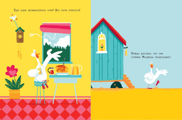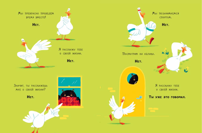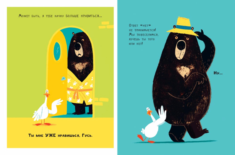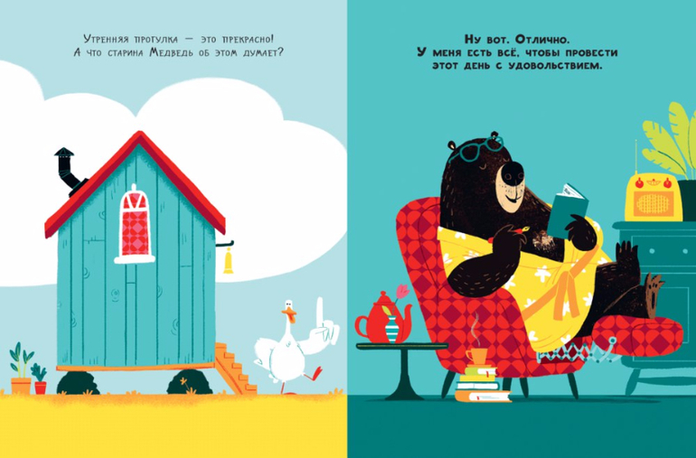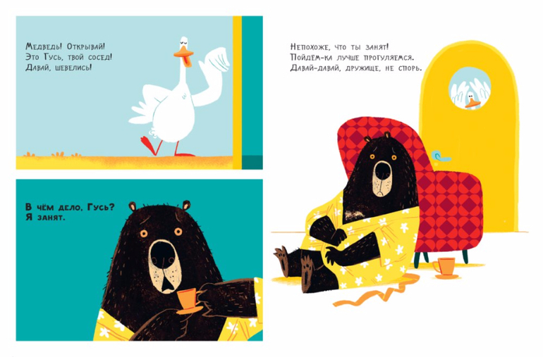 Юмористический дуэт Джори Джона и Бенджи Дэйвиса возвращается с новой порцией шуток про Медведя и Гуся! Предвкушая чудный денек, проведенный дома в тишине, Медведь усаживается в любимое кресло с книжкой и чашкой горячего чая... Но у его соседа Гуся другая идея. Несмотря на отказы Медведя, Гусь настаивает на том, чтобы прогуляться вместе. "Ты не выглядишь занятым! Давай-давай", - беспардонно командует Гусь. На самом деле, он просто мечтает понравиться медведю. Ох уж это вечное несовпадение экстравертов и интровертов! Но разве это препятствие для настоящей дружбы?