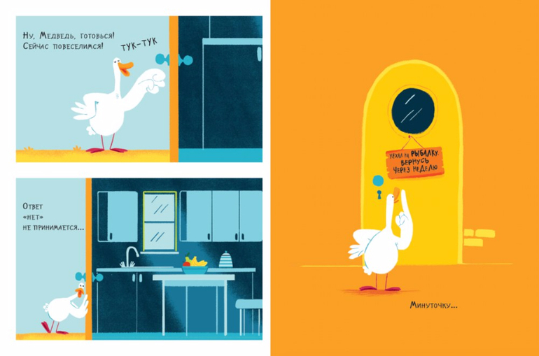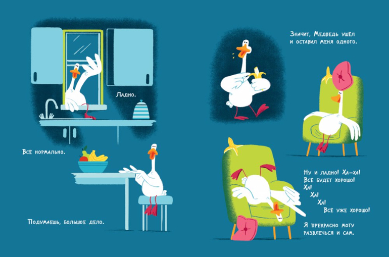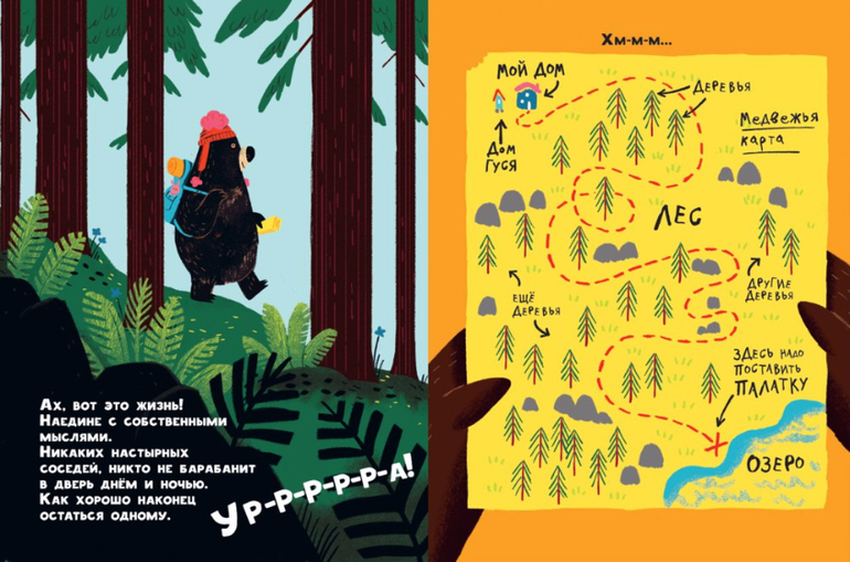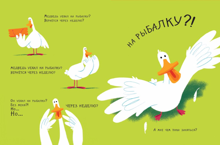 Третья и возможно лучшая история взаимоотношений гиперактивного Гуся и ворчливого Медведя от авторов «Пора уже спать!» и «Я уже тебя люблю!». Преисполненный решимости Гусь отправляется к Медведю в гости с самого утра. «Ну, Медведь, готовься! Сейчас повеселимся! Ответ «нет» не принимается!» Но никто и не думает ему отвечать. Медведя нет дома! Он отправился на рыбалку на целую неделю и безмерно счастлив своему уединению вдали от надоедливого соседа! Только вот палатку ставить Медведь не умеет. Да и рыбка не очень ловится. И другой еды с собой нет. А тут еще и дождь пошел…