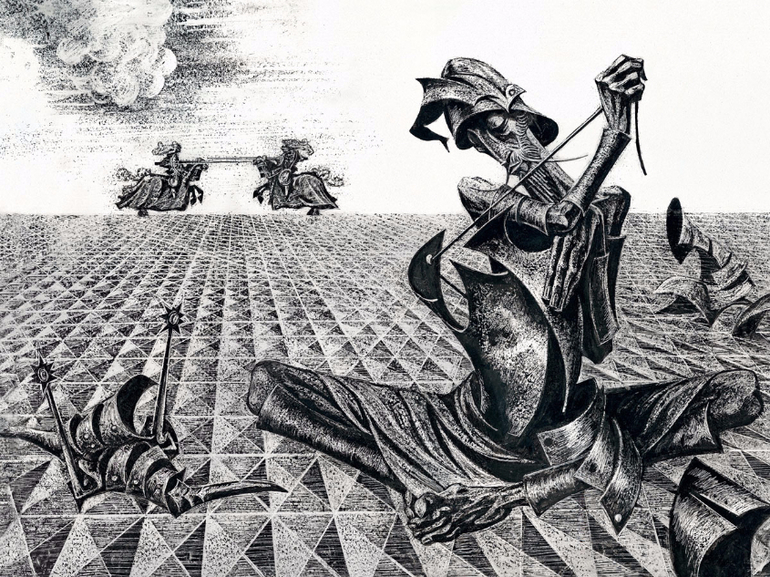 Но в иллюстрациях Бродского присутствует и третье действующее лицо - растресканная земля, уходящая в беспощадную даль. В этой пустыне человеческой и зародилась светлая вера Дон Кихота в истину, требующую служения и жертв...
