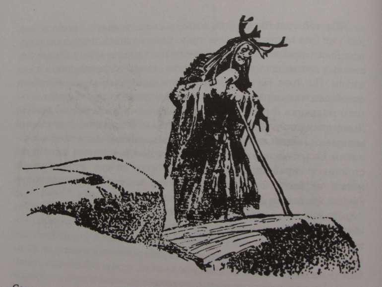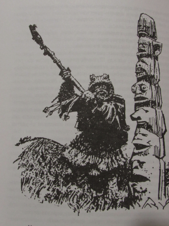 Весенний ветер трепал ее седые волосы, позвякивая костяными и каменными фигурками духов, подвешенными к ее тощим косицам. Холодно было старухе. Не двигаясь стояла она, всматриваясь в синеющий лес, из которого должны были выйти охотники.