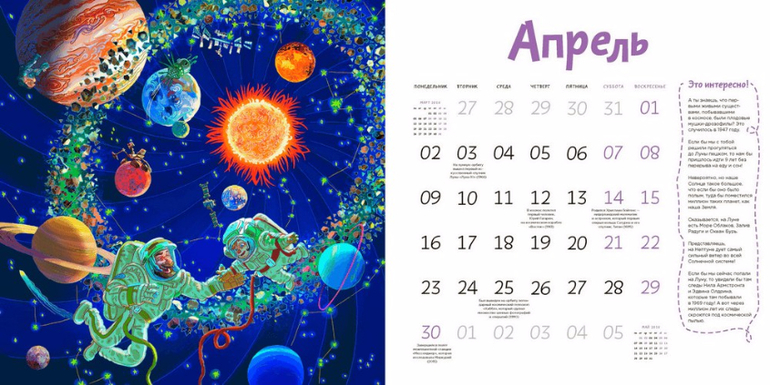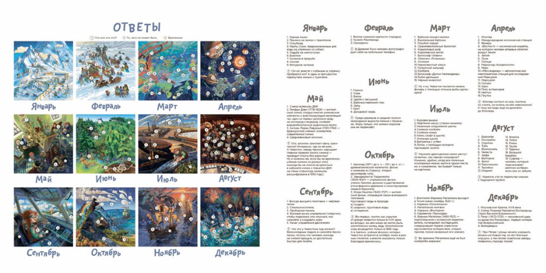 - Каждый разворот - виммельбух, где нужно отыскать спрятанные детали (в конце календаря есть ответы).