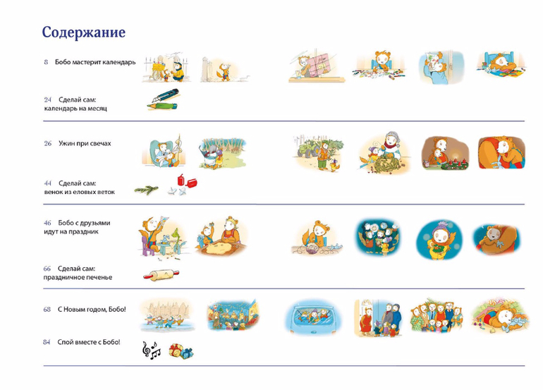 Четвёртая коллекция историй о Бобо - это книжка-игра, книжка-подсказка: помимо традиционных приключений, в которые попадает малыш, здесь собраны советы, как с пользой и интересом провести зимний вечер, а главное - как ускорить наступление Нового года. Бобо учится мастерить календарь, плести венок, готовить печенье. Конечно, он ещё слишком мал, чтобы делать всё самому, но помочь маме с папой уже в силах!