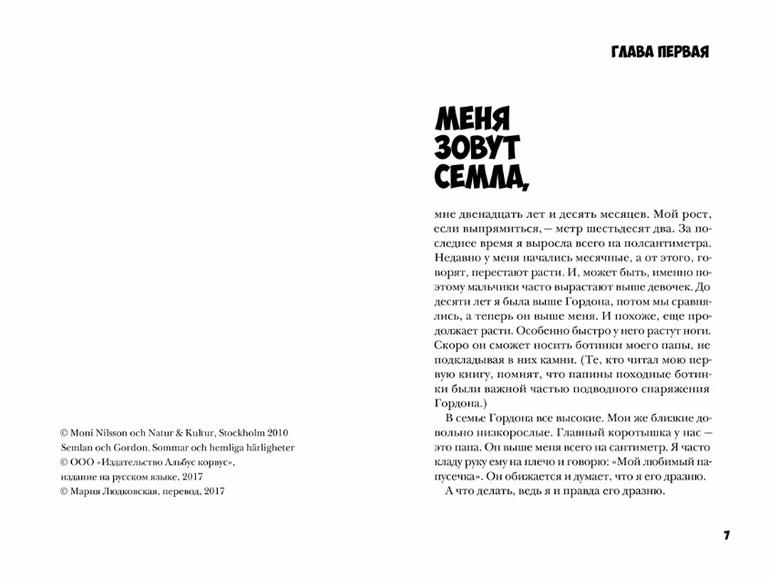 «Меня зовут Семла, мне 12 лет и 4 месяца. Вообще-то семла - это булочка с марципаном и взбитыми сливками. Когда я спрашиваю маму, почему меня назвали в честь булочки, она всегда говорит одно и то же: "Мне хотелось, чтобы такого имени ни у кого больше не было"».