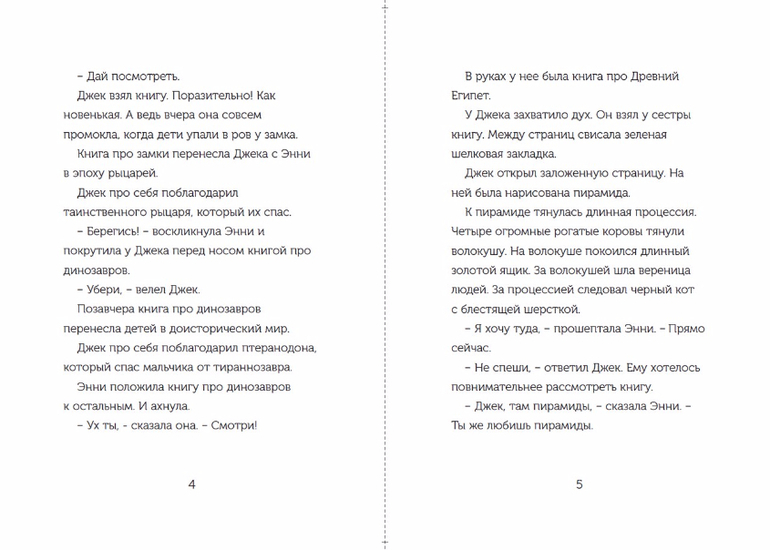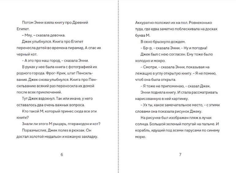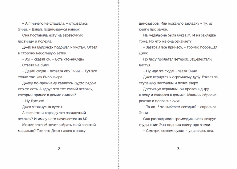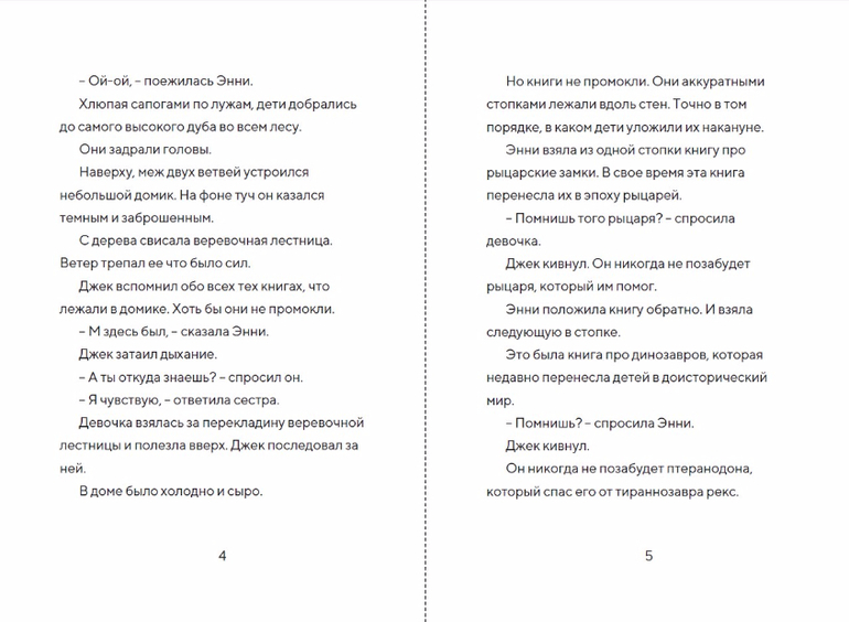 Серия «Волшебный дом на дереве» как будто специально создана для первого чтения после букваря. Небольшой объем текста (каждая книга не больше восьмидесяти страниц), простые предложения, крупный шрифт и увлекательные сюжеты - автор сделал все, чтобы увлечь чтением ребенка, который только недавно научился складывать из букв слова. Персонажи близки по возрасту потенциальному читателю этой книги, также они понравятся их родителям. Девочка Энни - очень смелая, она любит узнавать все на собственном опыте и не теряется в сложных ситуациях, а ее старший брат удивит своей рассудительностью: перед тем, как что-то делать, он предлагает подумать, а во время путешествий он не забывает вести дневник и записывать самое важное в блокнот. Не исключено, что после этих историй подобные привычки появятся и у маленького читателя