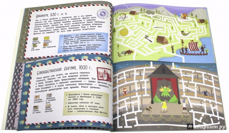 Все листы поделены на две части - догадаться, какой лабиринт будет следующим, не так-то просто. Нужно соединять половинки, проходить через лабиринты и заодно искать разные примечательные штуковины. По пути можно узнать кое-что интересное о разных временах и странах!