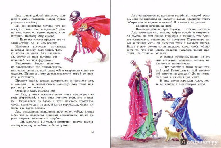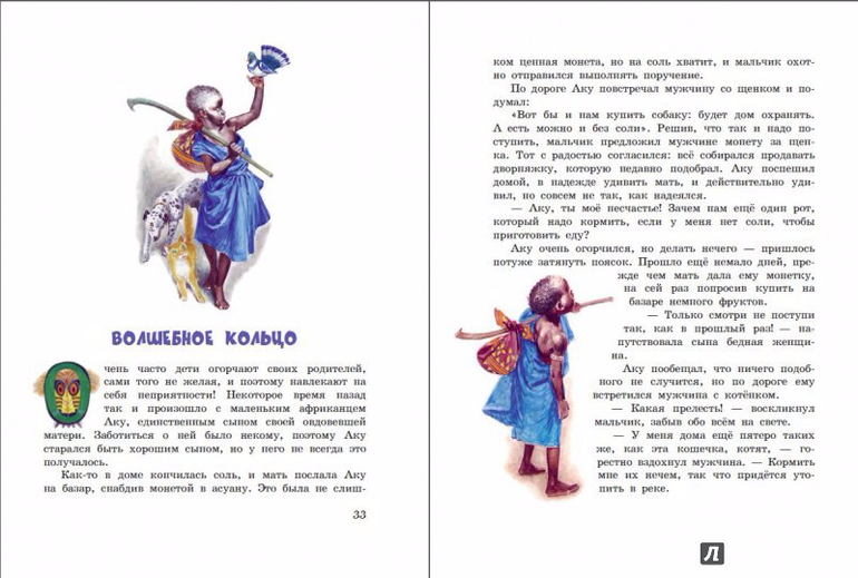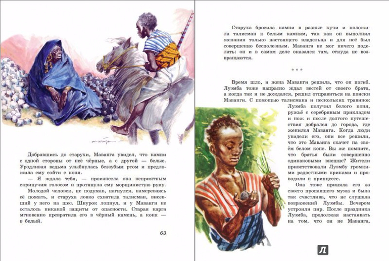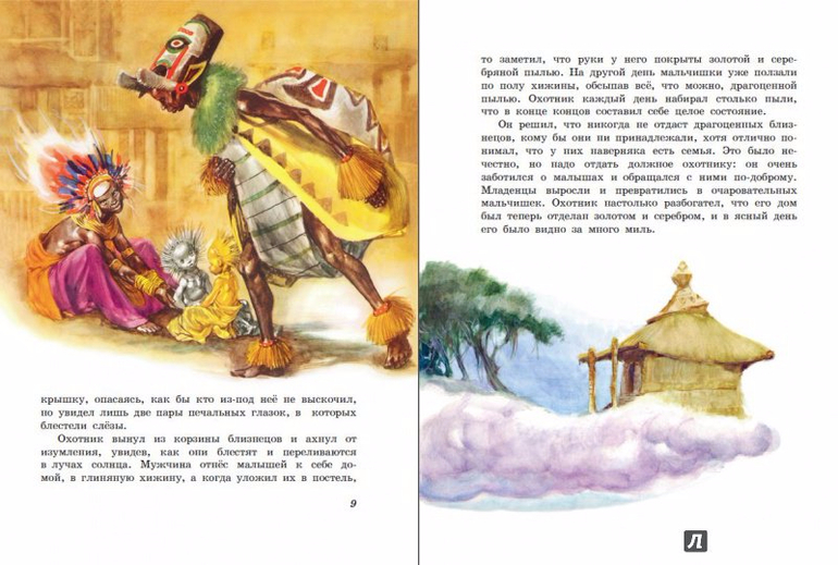 В книгу, иллюстрированную превосходными рисунками Л.Марайя вошли шесть сказок народов Африки. По её страницам гуляют водяные духи, прекрасные принцессы, братья-близнецы из золота и серебра, мудрые звери и птицы.