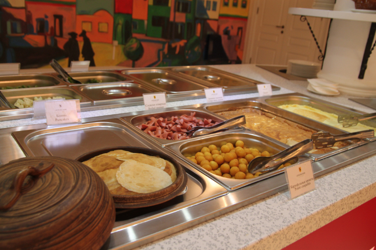 итак, завтрак это всегда 2 вида каш, хлопья, мюсли, творог, блинчики, творожная запеканка, омлет, яйца, сосиски, картофельные шарики, нарезка колбасная , сырная, овощи, выпечка, штрудель и шоколадные конфеты на завтрак!) шампанское, кофе-чай, кисломолочные напитки, морс, сок, вода...