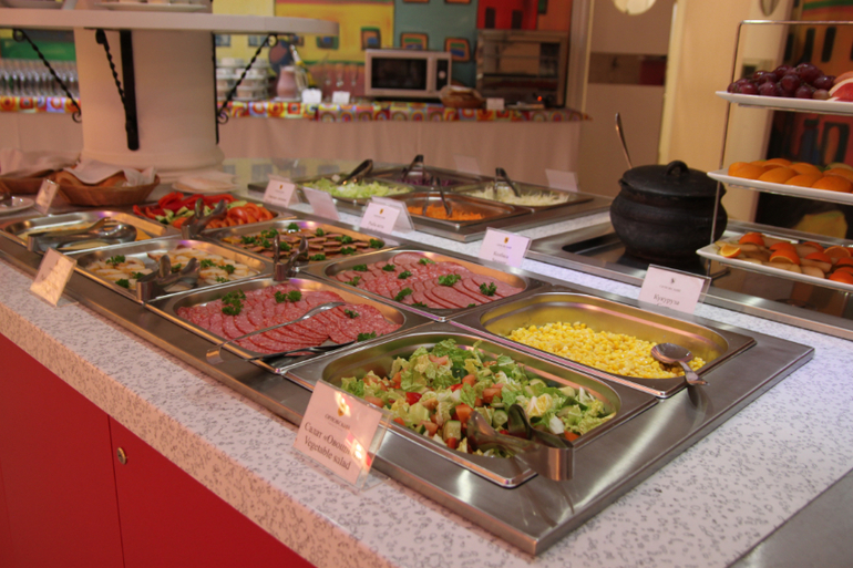 на обед: 2 вида первого, рыба, курица, несколько гарниров (гречка, макароны, картошка, овощи (на гриле или вареные), салаты, отдельно овощи, десерты.
