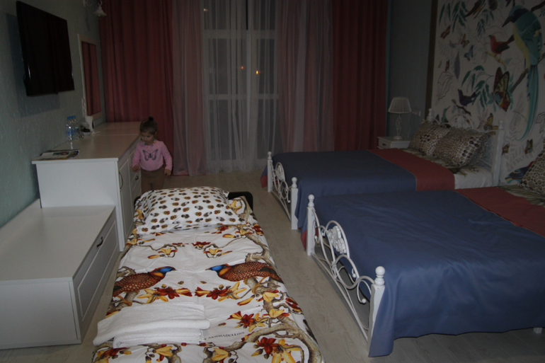 Номер довольно большой. 2 кровати большие + для Анюты уже было доп.место. (можно его было не брать). Так как на каждой кровати помещается спокойно по 2 человека). Доп.место потом поставили рядом с кроватями, так что у нас оставалось много свободного места.