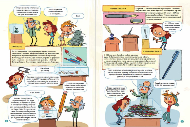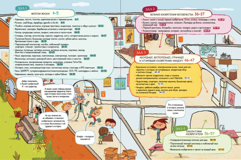 Познавательная книга о том, как появились не только важные изобретения в истории человечества, но и обычные предметы, которые мы используем в повседневной жизни. Вместе с героями книги юные исследователи отравятся на экскурсию, чтобы найти ответы на самые разные вопросы. Как бы мы жили, не будь, к примеру, пуговиц или непромокаемых плащей? А если бы так и не изобрели шариковую ручку? В нашем музее четыре зала, в первом собраны предметы, которые сделали нашу жизнь легче и комфортнее. Здесь вы узнаете о том, как появились ластики, пуговицы, чипсы, жвачка, йо-йо и др. Во втором - великие изобретения человечества: паровой двигатель, бумага, автомобиль, телескоп и др. Следующий зал отведен для устаревших и для самых абсурдных изобретений, будь то будильник на колёсах, гамак для ног и др. Ну и в последнем зале - лаборатория изобретателя! Здесь любой желающий сможет испытать свою смекалку и что-нибудь изобрести.
