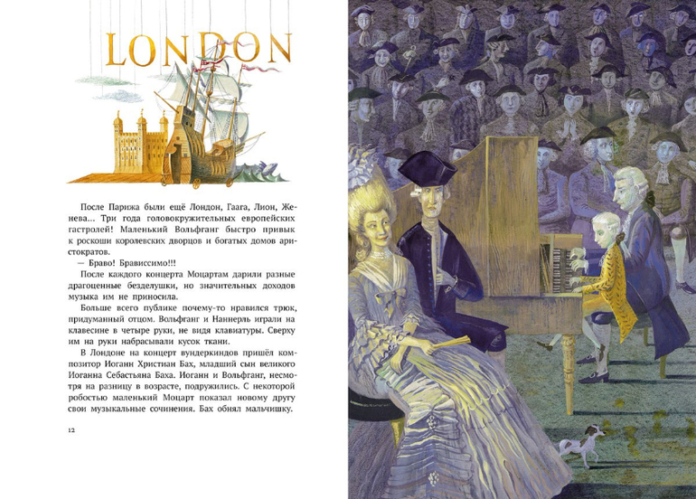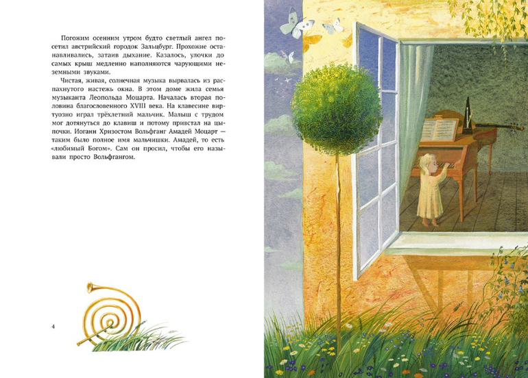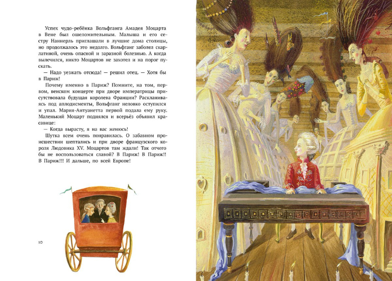 Вместе с отцом и старшей сестрой маленький Вольфганг путешествует по европейским столицам, исполняя музыкальные произведения вслепую. Слава о ребёнке-виртуозе раскрывает перед семейством Моцарт многочисленные двери императорских дворцов и соборов. Сказочные иллюстрации Виктории Фоминой отображают самые значимые события на творческом пути великого композитора.