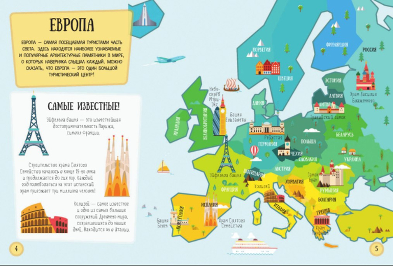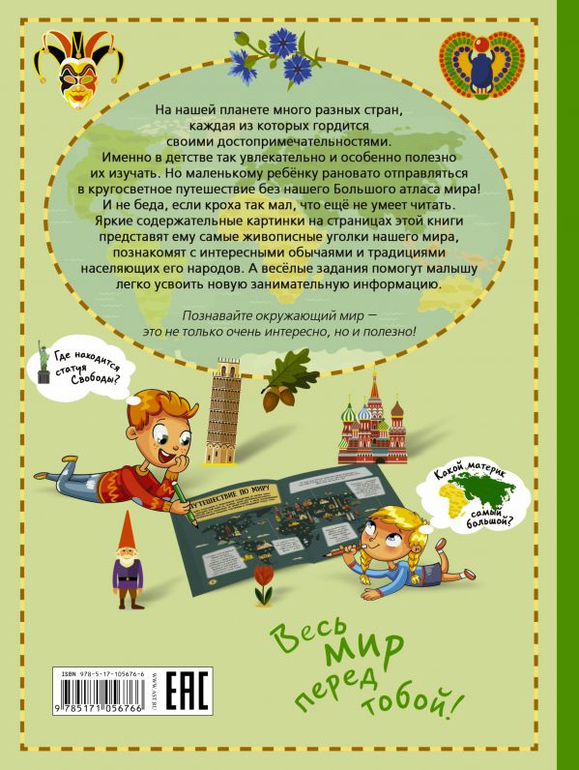 Любознательного малыша не так просто порадовать новой книжкой. Но наш атлас мира в картинках привлечёт внимание даже самого дотошного маленького читателя. На его ярких страницах он найдёт простые даже для понимания крохи карты всех континентов и многих стран. И каждая карта доступным ребёнку языком картинок расскажет об основных достопримечательностях заинтересовавшей его страны и о животных, которые там обитают. "Большой атлас мира в картинках для малышей" порадует не только детей, но и родителей. Теперь им не придётся прилагать усилия, чтобы придумать вечернюю сказку: рассказы о достопримечательностях Европы, Азии, Африки, Америки и Австралии завладеют воображением ребёнка надолго. А весёлые задания помогут малышу легко усвоить полученные знания.