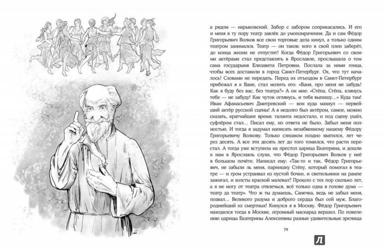 Повесть о русском театре XVIII века дополняют иллюстрации Татьяны Паянской.