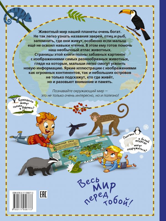Эта книга "Большой атлас животных в картинках для малышей" предназначена для самых маленьких, для тех, кто еще не умеет читать, но хочет знать как можно больше об окружающем мире. В ней представлены животные, которые обитают в различных климатических зонах. Они такие разные, что запомнить их всех будет непросто. Усвоить новую информацию, изложенную в атласе, помогут весёлые задания, пройдя которые кроха уж точно не забудет их забавных персонажей. А множество ярких картинок покажет представителей земной фауны именно в тех местах, где они обитают. Издание представит интерес и для родителей, которые с удовольствием помогут малышам разобраться с первыми в их жизни географическими картами.