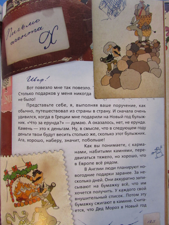 Кроме сказок и рассказов в книге есть странички, на которых Витя Велосипедов предлагает сделать какую-нибудь новогоднюю поделку. Например сделать календарь на 10 лет, вырезать из бумаги Деда Мороза, нарисовать Деда Мороза, сделать красивую новогоднюю упаковку для подарка.
