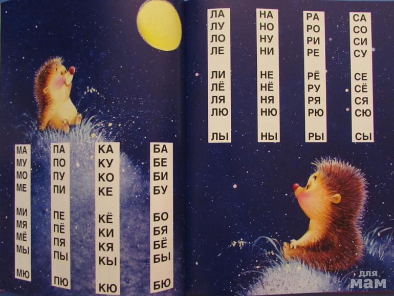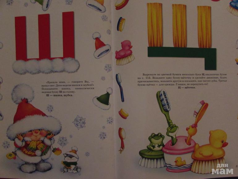 Первый разворот книги знакомит с буквой: на одной странице расположен предмет, напоминающий эту букву (А - акробат, И - индеец, П - перекладина), а на другой написана сама буква и изображена ситуация, в которой эту букву можно услышать (А - «Что нужно говорить, когда доктор тебе осматривает горло?», И - "Как кричит осел?, П - как пищат птенцы?).
