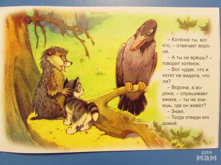 На помощь котёнку приходят разные лесные звери - зайцы, белки, ежи. Но помогла котенку только ворона, которая всё-всё знает. Вот она-то показала малышу дорогу домой.