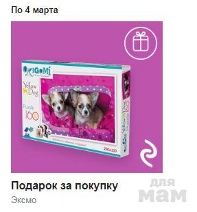 Акция Озон - пазлы от Эксмо в подарок.С 19 февраля по 4 марта 2018 выберите книги из раздела акции на сумму от 699 рублей и положите их в корзинуОформите заказПолучите пазлы в подарок