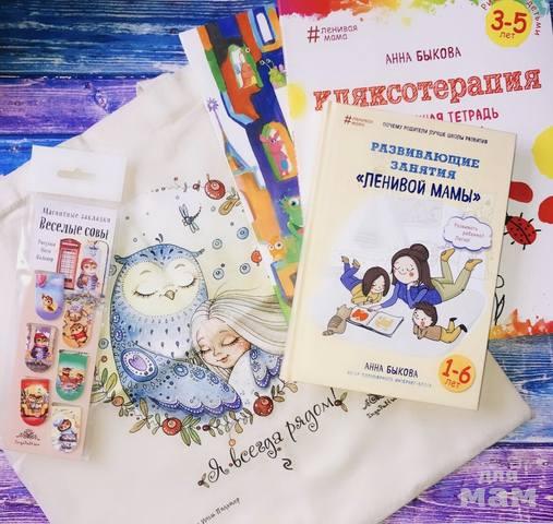 В подарочный комплект входит сумка для книг «Я всегда рядом с тобой», шесть магнитных закладок «Веселые совы», книга Анны Быковой «Развивающие занятия «Ленивой мамы» и рабочая тетрадь «Кляксотерапия», а также «Цветная книга эмоций» Виктории Шиманской.