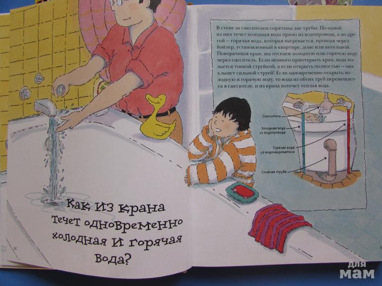 «В стене за смесителем спрятаны две трубы. По одной из них течет холодная вода прямо из водопровода, а по другой - горячая вода, которая нагревается, проходя через бойлер, установленный в квартире, доме или котельной. Поворачивая кран, мы пускаем холодную или горячую воду через смеситель. Если немного приоткрыть кран, вода польется тонкой струйкой, а если открыть полностью - она хлынет сильной струей! Если одновременно открыть холодную и горячую воду, то вода из обеих труб перемешается в смесителе, и из крана потечет теплая вода»