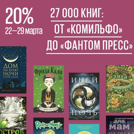 Скидка 20% (+ накопительная) — на 27 000 книг: от «Комильфо» до «Фантом Пресс».Акция действует с 22 по 29 марта.