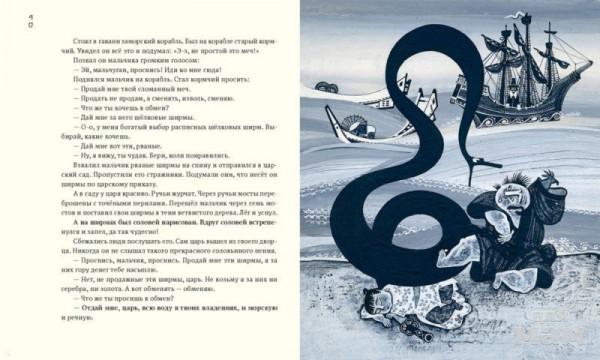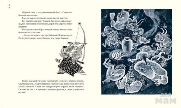 Именно чудеса привлекли внимание художника Геннадия Калиновского в первую очередь. В его иллюстрациях громовики и огненная зарница насылают на землю дождь с громом и молниями; у обидчиков слабых вырастают длинные носы; разъярённые черти на колеснице гонятся за сбежавшими героями; меч оборачивается грозным змеем и бросается на вора… Подобные сцены стали для художника полем для экспериментов: он выбирает сложную технику и выстраивает необычные ракурсы. А в дополнение делает небольшие штриховые рисунки - ироничные по смыслу и изящные по исполнению.