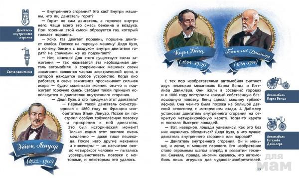 Новая книга из серии детских энциклопедий с Чевостиком расскажет об истории наземного транспорта. Путешествуя во времени вместе с любимыми героями, ребенок узнает, как наши предки перевозили тяжёлые грузы и передвигались на дальние расстояния, разберётся, как устроен паровой двигатель и двигатель внутреннего сгорания. Прокатится на карете, побывает на «Формуле-1» и увидит, как устроен конвейер. А еще выучит дорожные знаки и правила дорожного движения.