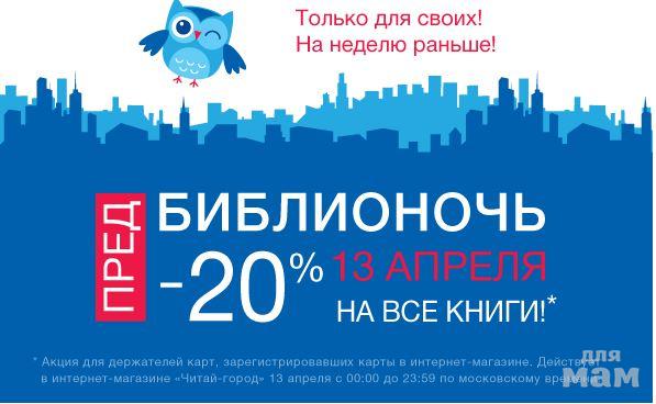 Приятный сюрприз для любимых покупателей! Только для держателей бонусной карты ЧИТАЙ ГОРОДА долгожданная «Библионочь» состоится сегодня, 13 апреля! Выбрать книги - СсылкаДля всех остальных она пройдёт 20 апреля.