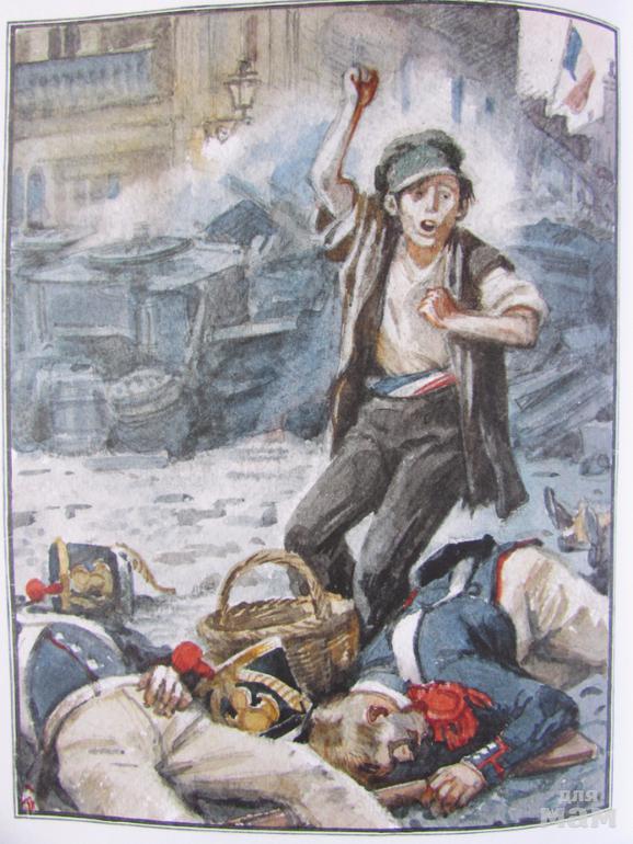 Наравне со взрослыми Гаврош отважно сражается на парижских баррикадах, подбодряя всех своими стихами и песнями.