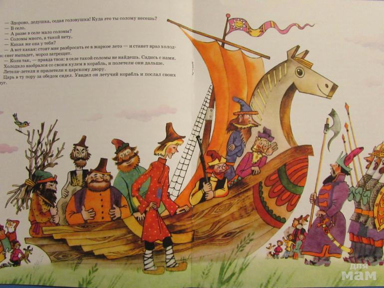 Вот однажды дошла до той деревни весть: кто построит царю такой корабль, чтоб и по морям ходил и под облаками летал, - за того царь свою дочку выдаст.