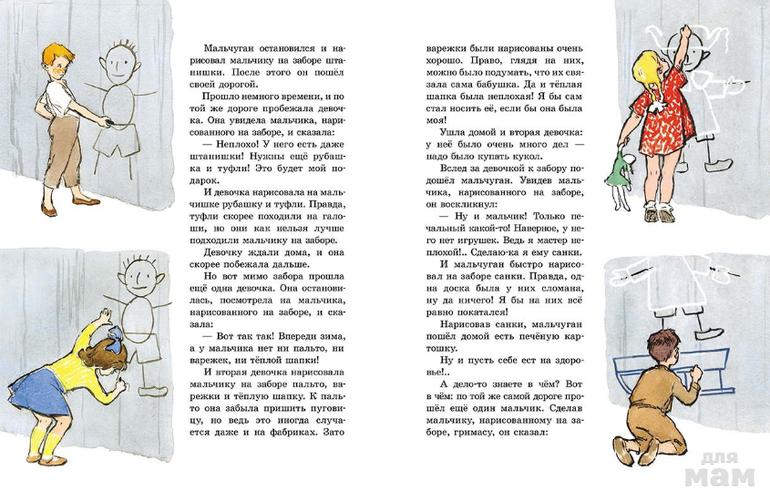 Дети по очереди рисуют на заборе мальчика: сначала руки-ноги-голова, потом одежда, санки и т.д. Хороший получился рисунок. Но вот появился горе-художник и подрисовал мальчику высунутый язык. И эта глупая шалость в один миг испортила и рисунок, и настроение всех, кто проходил мимо забора.