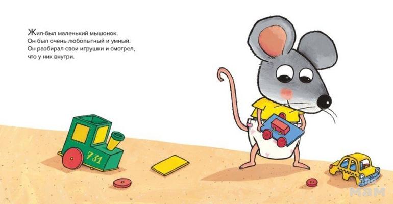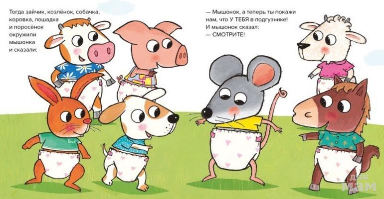 Маленькому любознательному мышонку очень интересно, что спрятано в игрушках, в баночках, в норках и даже в подгузниках его друзей, но то, что он обнаруживает там, ему совсем не нравится. Зайчик, козлик, коровка, лошадка и поросёнок тоже хотят посмотреть, что в подгузнике у их любопытного друга. Но их ожидает большой сюрприз - подгузник мышонка абсолютно чист, потому что он уже ходит на горшок!