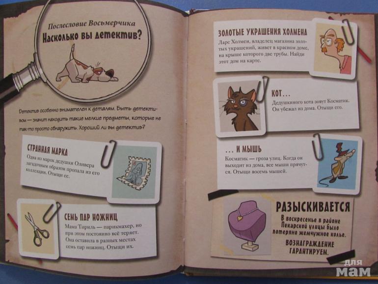 Например, найти на страницах книги сем пар ножниц потерянных мамой Тириль. Или отыскать восемь мышек прячущихся от кота. И др. задания.