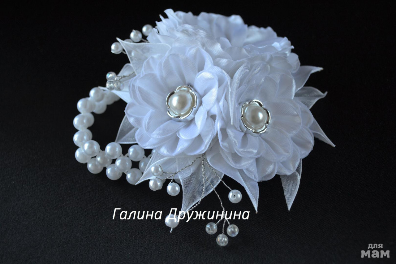 1) Резиночка на пучок. 3 цветка с бусинами. Плетение из бусин на крепкой резинке, растягивается и надевается на пучок